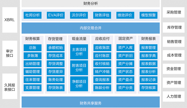 2. 企业运营层:满足企业日常财务核算需要,包括了集团财务的具体应用:财务核算、现金管理、固定资产、财务报表、财务分析等。