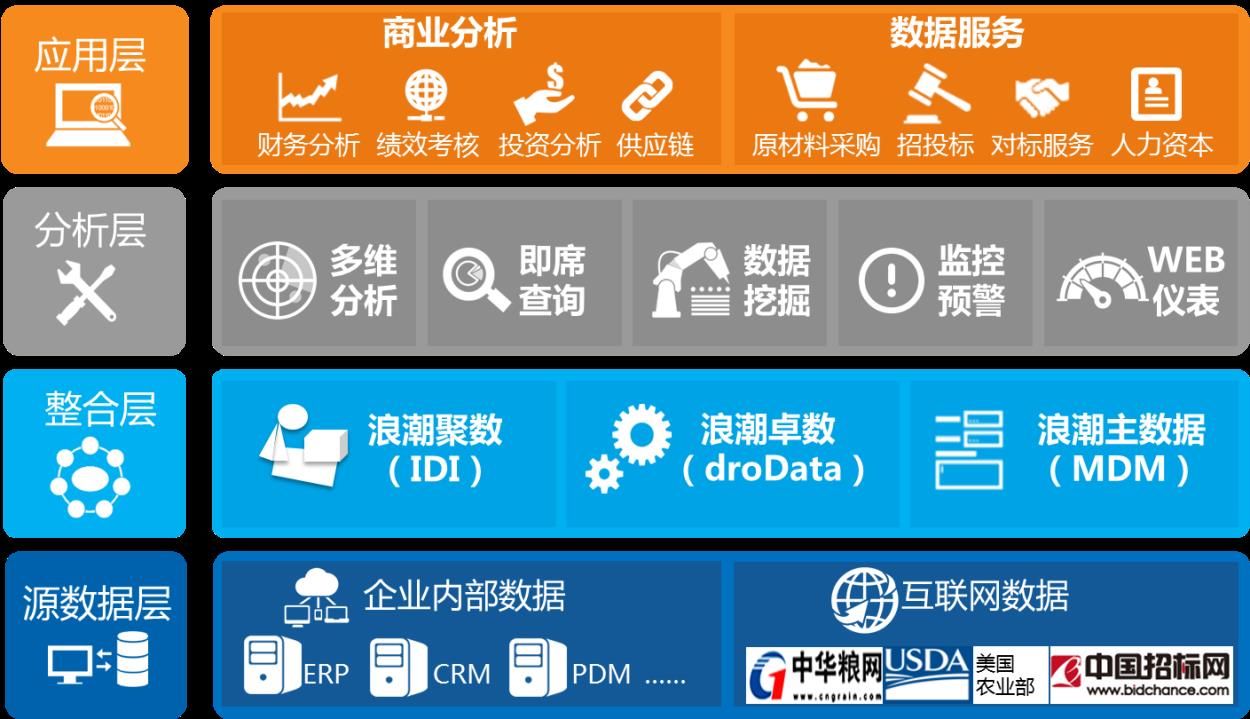 浪潮BA分为数据整合层、商业智能分析层、应用层三个层次。数据整合层提供数据仓库的建设;商业智能分析层提供了多种BA工具,针对企业不断变化的分析需求,快速生成与之相关的查询、报表、报告、驾驶舱,及时反映企业的真实情况;同时浪潮BA提供了7类经营分析和信息披露、风险防控应用模型。 用户也可以利用BA工具开发自已的经营分析,来不断丰富展现内容,为决策提供更好的支持;并且提供多种登录方式,方便用户随时随地掌握一手数据。